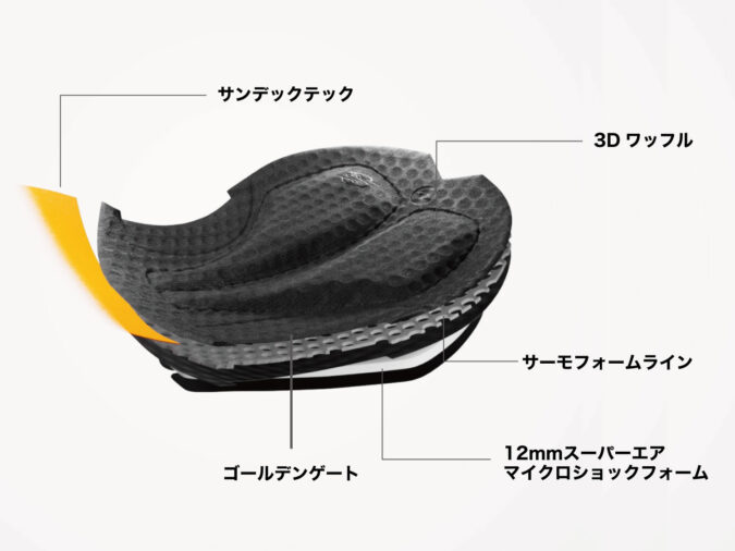 何が最高かって例えばいくつかのフォームが重ねられていますよね。これはそれぞれ素材を変えることで、それぞれ違う種類の振動を吸収しやすくすることで振動吸収性を高めるというもの。ただ分厚いだけじゃないんです。